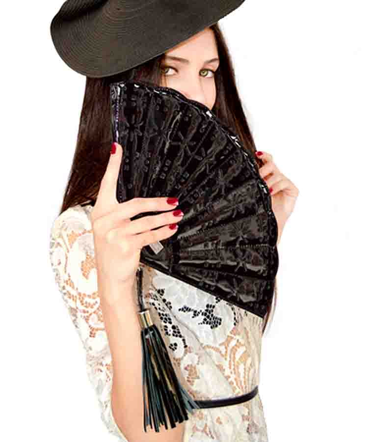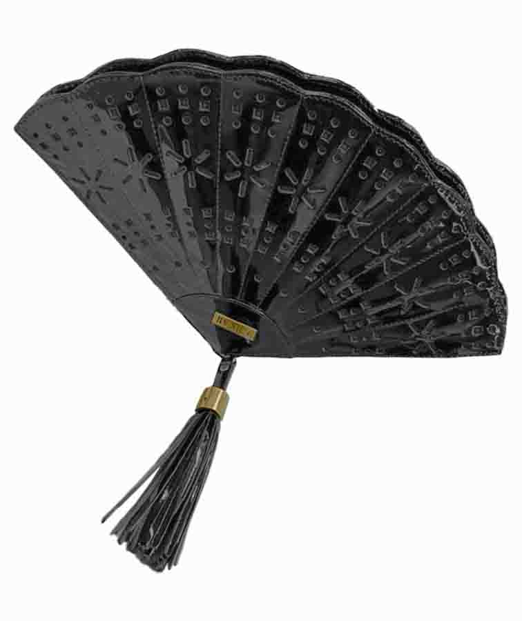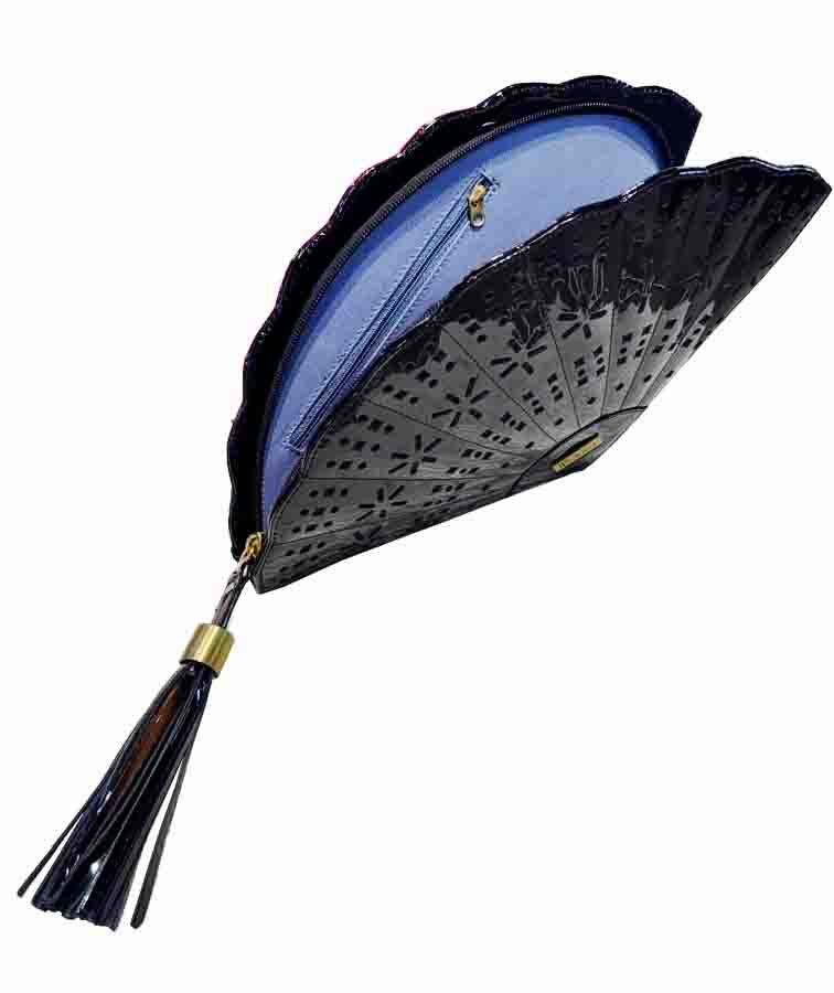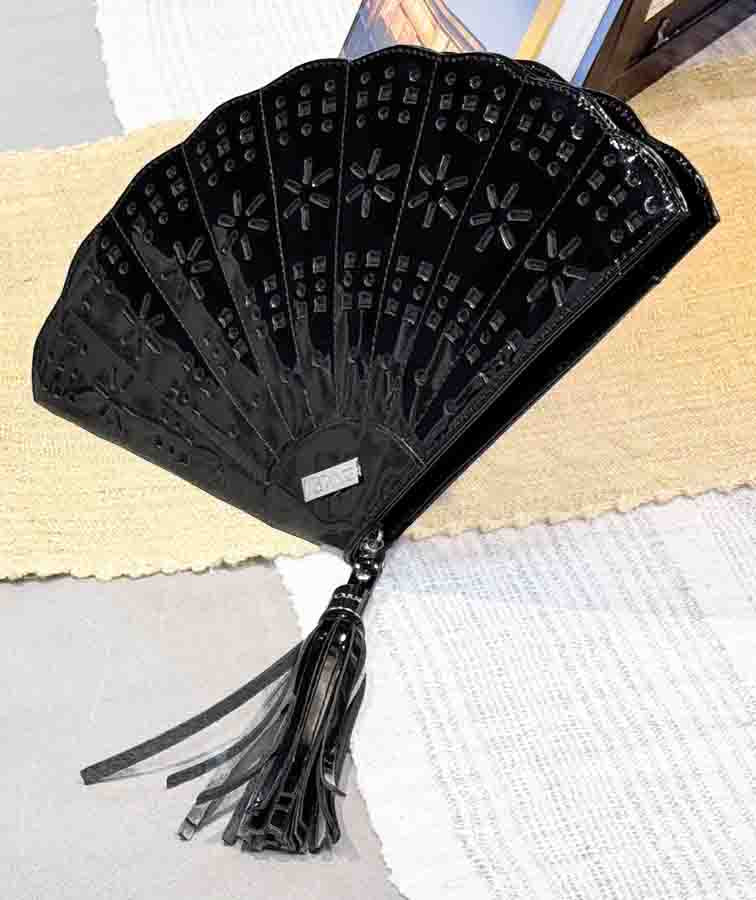 Elegant and eye-catching, this unique clutch is crafted in glossy black patent leather, shaped gracefully like a traditional Spanish fan. Intricate perforations in the leather create a striking design that enhances its dramatic silhouette. The wide-opening zipper is adorned with a luxurious tassel puller, finished with a brass cap engraved with the JPO logo. Inside, you’ll find a zippered pocket on one side and an open pocket on the other, offering smart organization for essentials like cash, a phone, lipstick, keys, and a small perfume. Perfect for weddings, galas, or any event where you want to make a sophisticated statement.