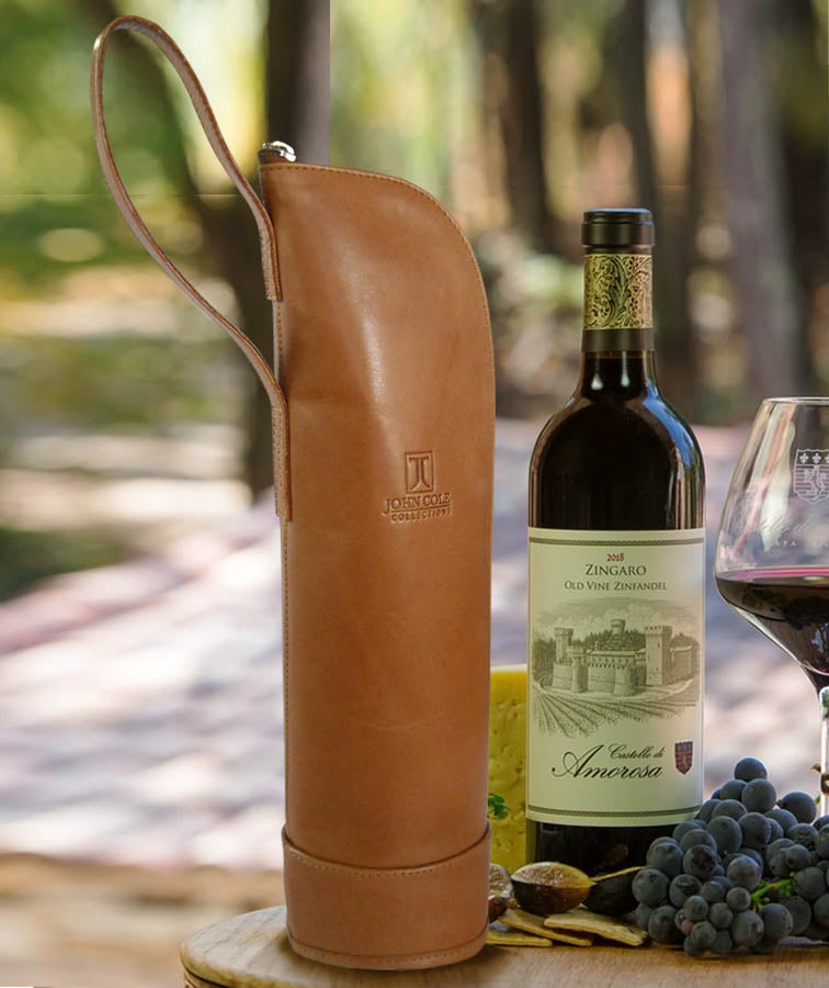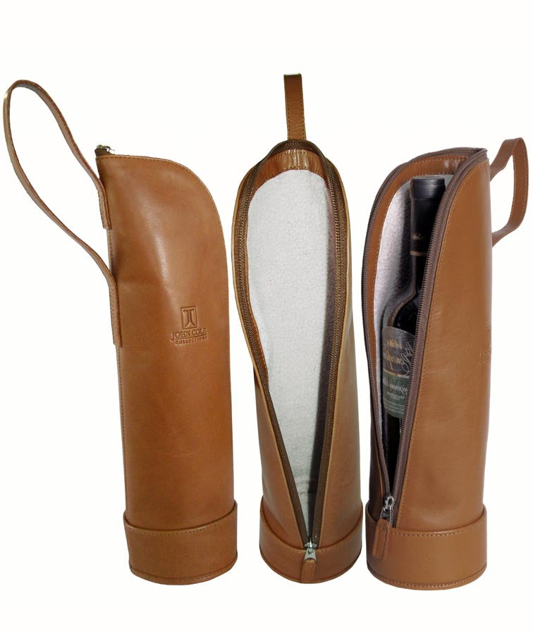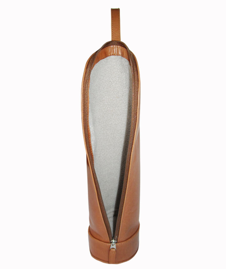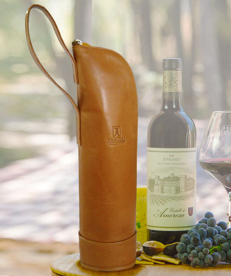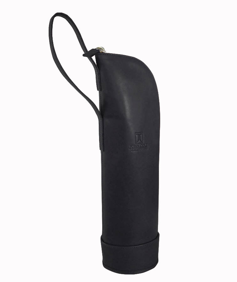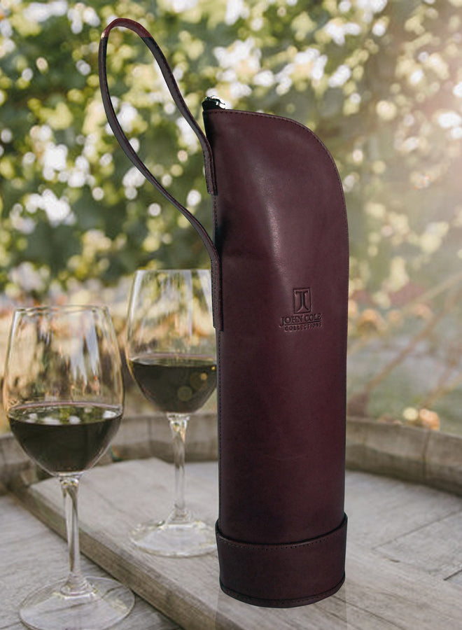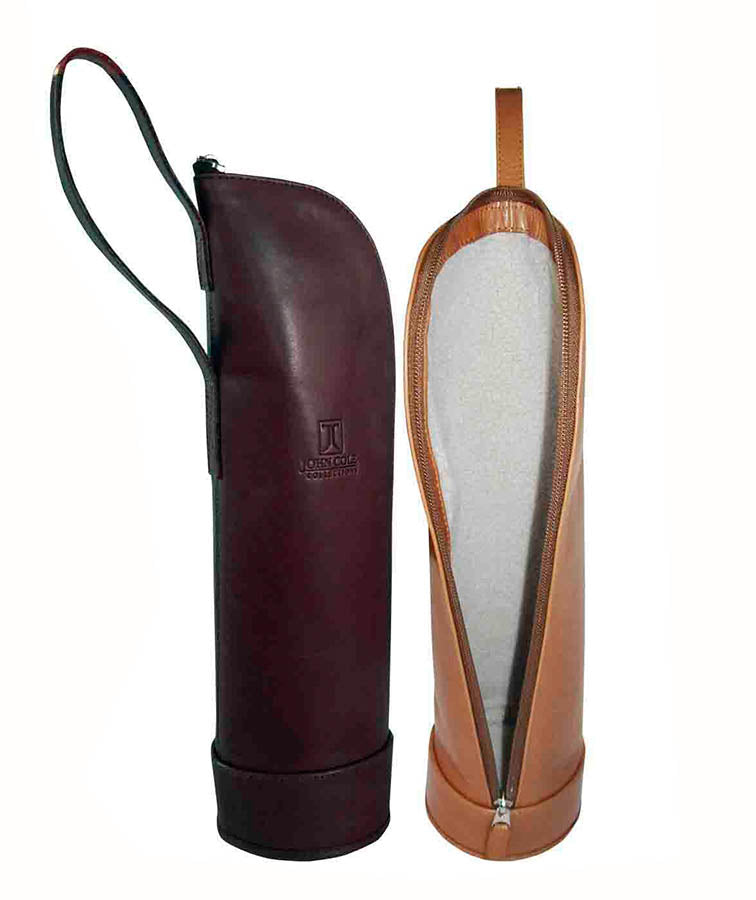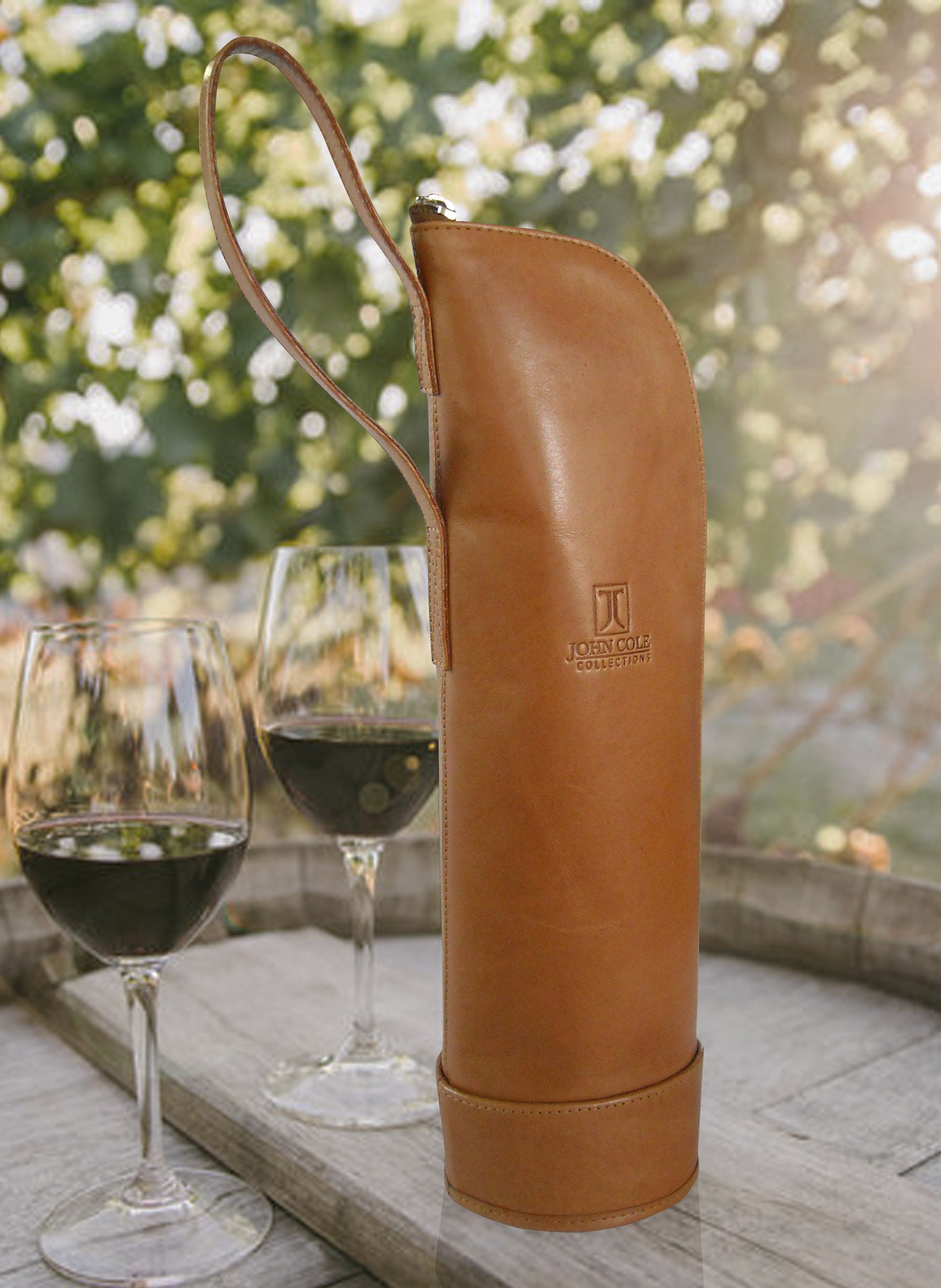 A color-matched zipper runs seamlessly from the leather base to the back, where it meets a sturdy handle sized to comfortably carry the weight of a full bottle.