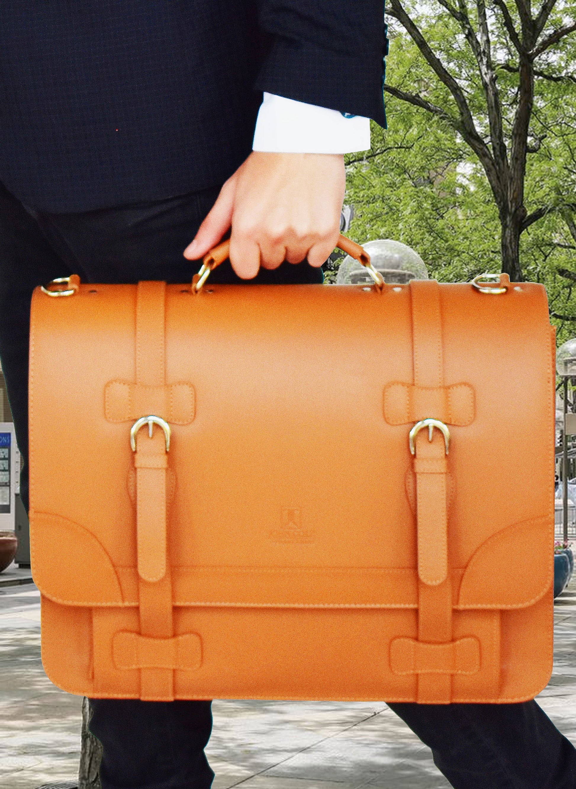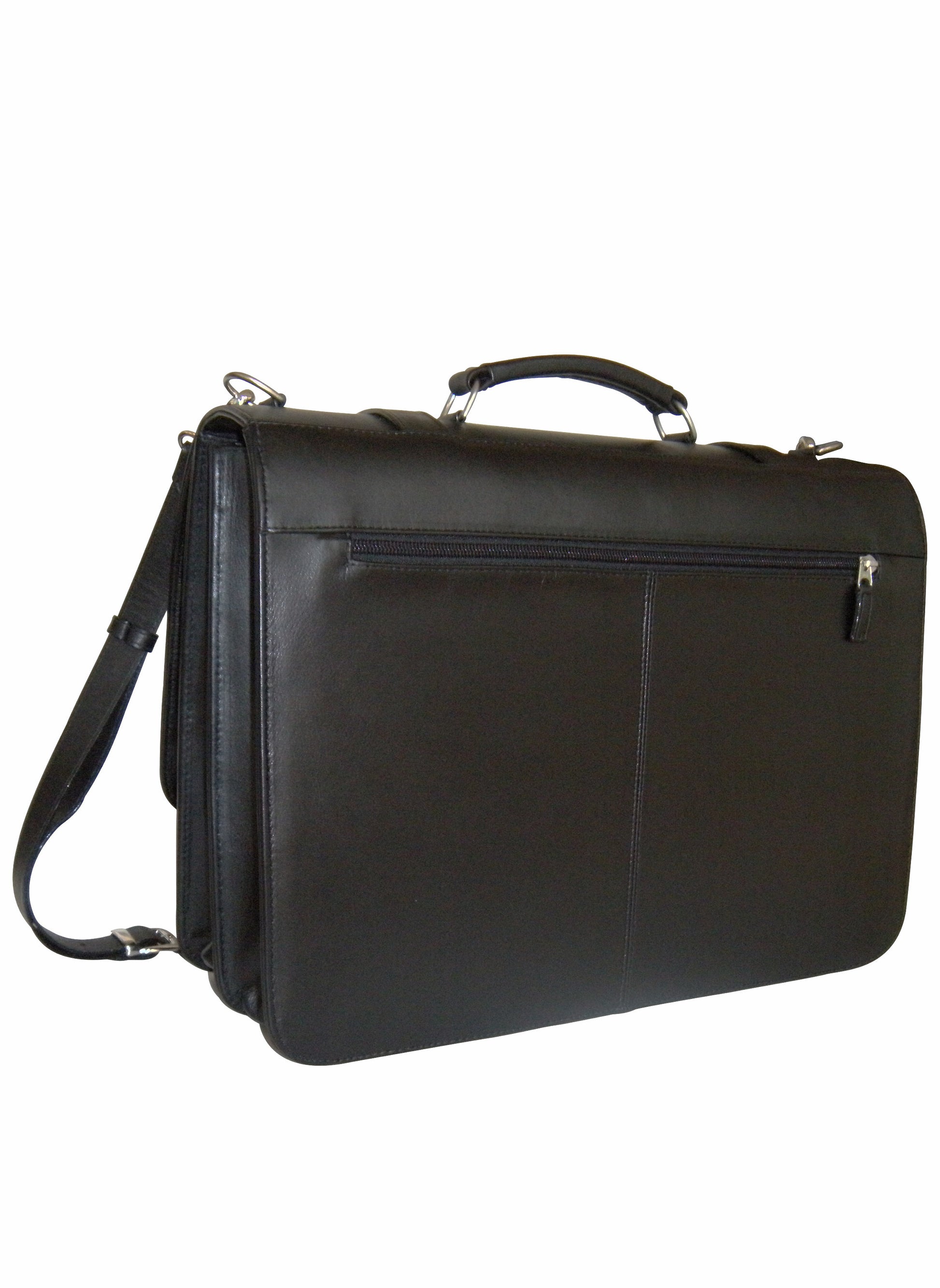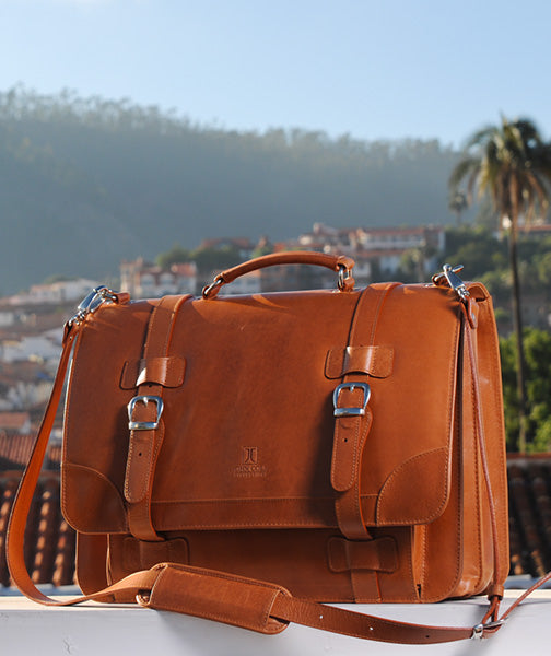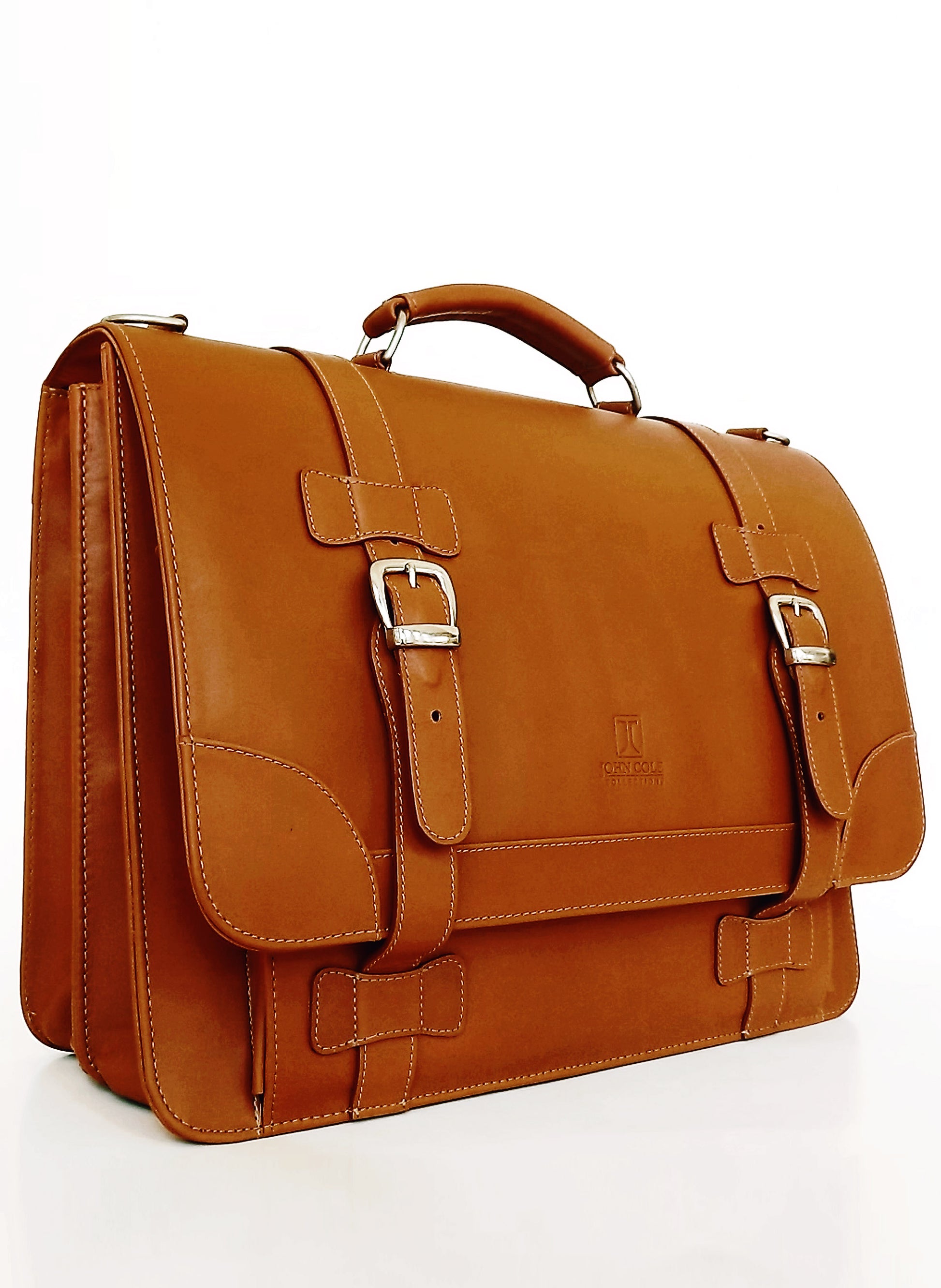 Our Thomas is a sophisticated briefcase with classic lines. Handcrafted in smooth Crinkled Cowhide leather, this briefcase / laptop bag is structured with expandable side gussets to make sure you are able to fit all essentials. Magnetic snaps are hidden under the decorative front buckles allowing easy access to the interior which reveals two deep wells for computer, files and hardware. We have also included a center zippered compartment for files and papers as well as several zippered side wall pockets and an organizer for cell phone, pens, cards and other items to keep you in order. The adjustable strap has a padded shoulder rest and we have included a leather handle for carrying ease.